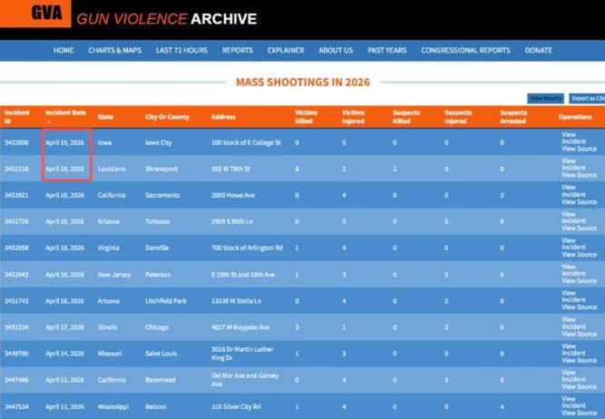 圖片來(lái)源:美國(guó)“槍支暴力檔案”網(wǎng)站(GVA)當(dāng)?shù)貢r(shí)間4月19日截圖