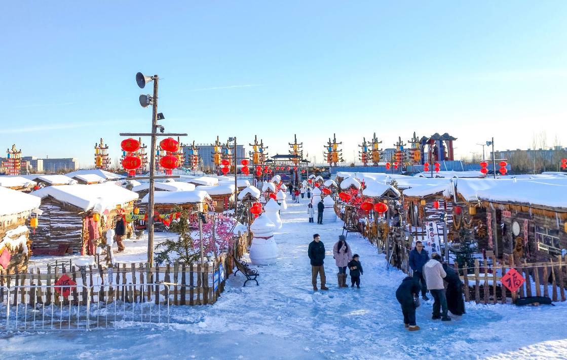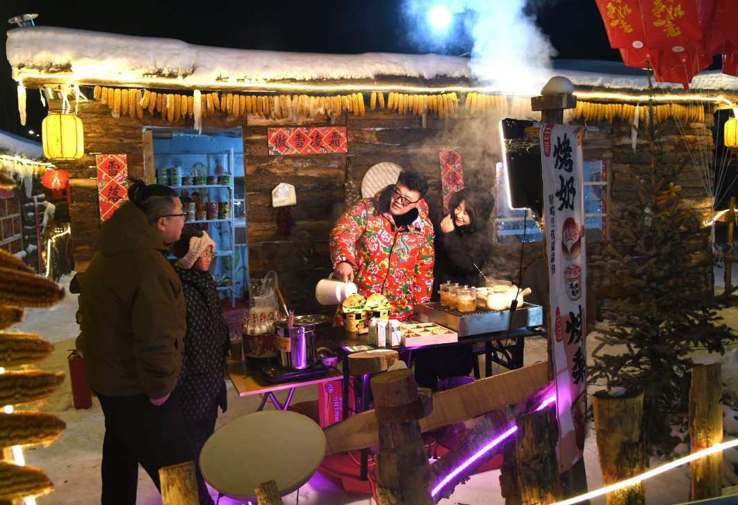 踏入雪鄉(xiāng)板塊,50個(gè)復(fù)刻北方傳統(tǒng)風(fēng)貌的院落集群映入眼簾,木柵欄上垂掛的紅燈籠與蓬松雪層相映成趣,屋檐下懸垂的雪舌、雪簾勾勒出童話般的輪廓。每個(gè)院落都藏著專屬打卡場(chǎng)景,推門(mén)而入可見(jiàn)家庭場(chǎng)景,窗外是皚皚白雪,屋內(nèi)飄著燒烤、火鍋和奶茶的醇厚香氣,瞬間驅(qū)散冬日寒意。游客穿梭其間,鈴鐺輕響,為這份雪鄉(xiāng)煙火氣增添了濃郁的民族風(fēng)情。