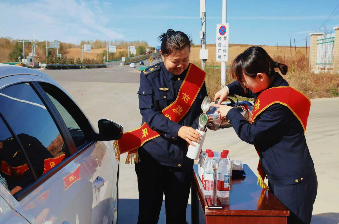 工作人員為過往司乘提供熱水