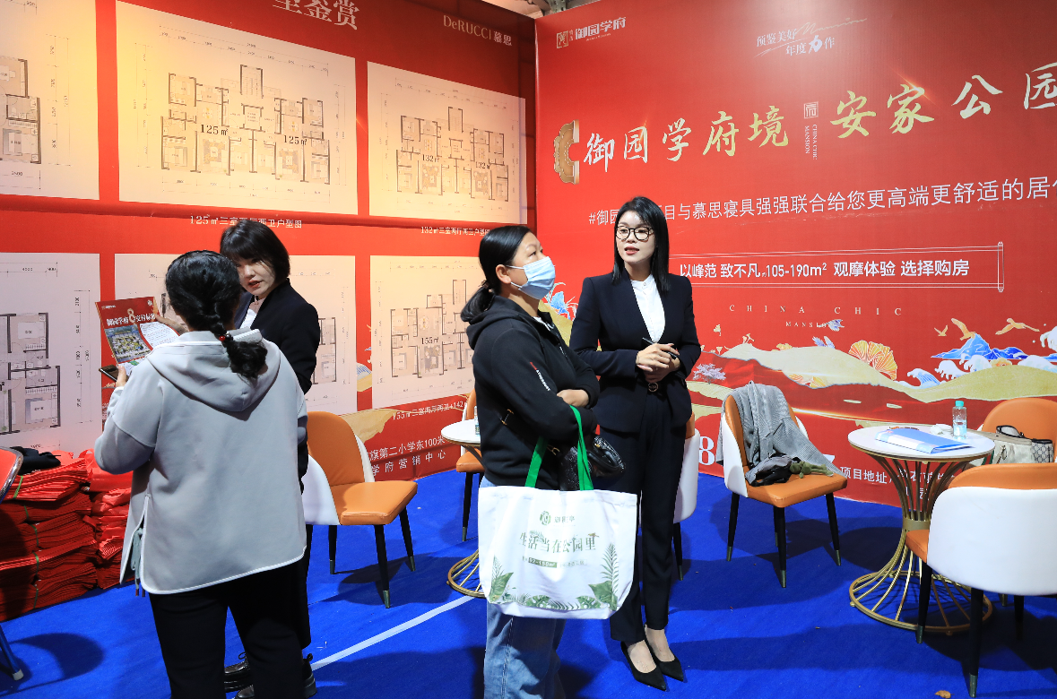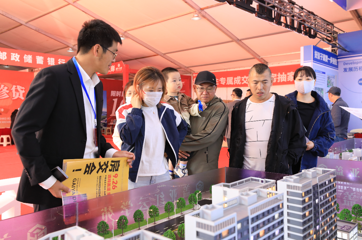 房產(chǎn)銷售人員為市民講解戶型特點(diǎn)
