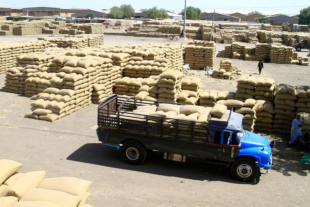 當(dāng)?shù)貢r(shí)間2024年2月22日,蘇丹東部杰達(dá)雷夫市,卡車在一個(gè)市場(chǎng)里運(yùn)送谷物。聯(lián)合國糧食計(jì)劃署表示,蘇丹長期武裝沖突導(dǎo)致當(dāng)?shù)亟^大多數(shù)人都面臨饑餓。