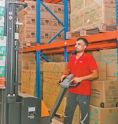 工作人員在位于阿聯(lián)酋迪拜的極兔速遞海外倉內(nèi)搬運(yùn)貨物。本報記者 任皓宇攝
