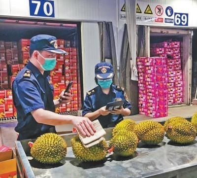 2024年8月1日,在廣西憑祥友誼關口岸海關查驗平臺,工作人員在查驗一批進口榴蓮。本報記者 牛 震攝