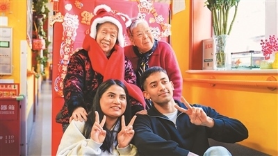 外籍志愿者在三里屯一家養(yǎng)老院內(nèi)與老人合影留念。