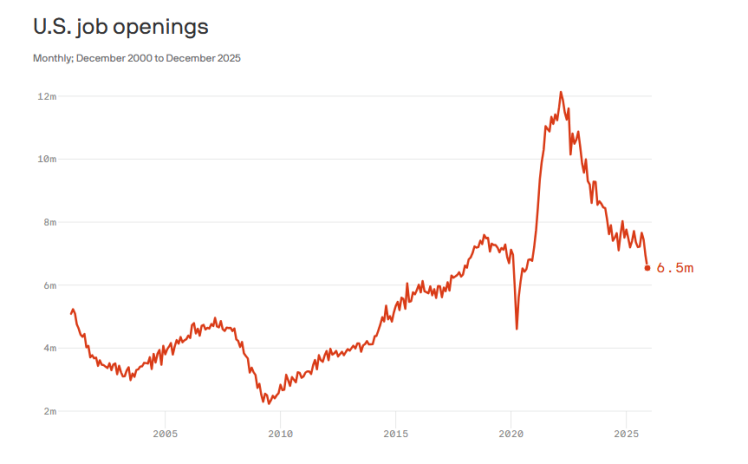 美國《國會山報(bào)》援引美國勞工統(tǒng)計(jì)局的數(shù)據(jù)報(bào)道稱,美國2025年12月份的職位空缺數(shù)量為650萬個(gè),呈下降趨勢,較上年同期減少了96.6萬個(gè)。