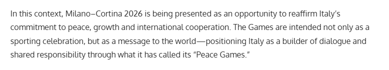 文章認(rèn)為,2026年米蘭-科爾蒂納冬季奧運(yùn)會(huì)舉辦的意義遠(yuǎn)不止于爭奪金牌,還將有力推動(dòng)全球旅游業(yè)復(fù)蘇、促進(jìn)和平理念傳播,并通過體育運(yùn)動(dòng)將不同文化緊密連接。
