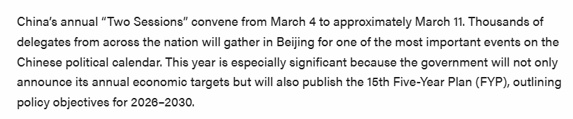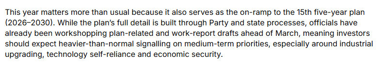 文章說,今年的兩會尤為關鍵,將為第十五個五年規(guī)劃(2026-2030年)奠定基礎。投資者應關注比往年更明確的政策信號,特別是在產業(yè)升級、科技自主和經濟安全等領域。