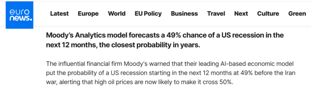 美政府接連出手的背后是疲軟的經(jīng)濟與通脹的預(yù)期無法承受高油價。而放任針對能源基礎(chǔ)設(shè)施的襲擊將進(jìn)一步威脅全球能源供應(yīng),推高油價。目前美國汽油價格已飆升至自2023年以來的最高水平,而據(jù)歐洲新聞臺3月18日報道,穆迪分析(Moody's Analytics)模型預(yù)測,未來12個月內(nèi)美國經(jīng)濟陷入衰退的概率為49%,這是多年來最接近臨界點的一次。該模型還提醒稱,當(dāng)前高企的油價很可能使這一概率突破50%。