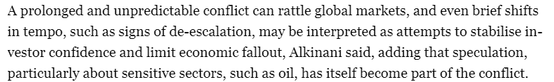 一名研究中東地區(qū)的金融分析師澤頓·阿爾基納尼(Zeidon Alkinani)告訴半島電視臺,曠日持久且難以預測的沖突會動搖全球金融市場的信心,即使是短暫的節(jié)奏變化,例如局勢緩和的跡象,也可能被解讀為試圖穩(wěn)定投資者信心和限制經(jīng)濟損失。阿爾基納尼強調(diào),“投機行為,特別是對石油等敏感行業(yè)的投機行為,本身也已成為沖突的一部分?!?/p>