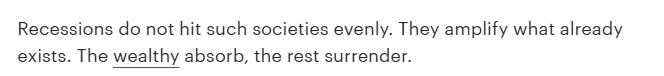 文章指出,經(jīng)濟衰退從來不會公平地影響整個社會。它只會加劇現(xiàn)有的社會分化:富人能夠化解危機,而窮人只能舉手投降。