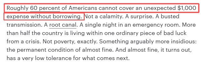 文章介紹,約60%的美國人若遭遇1000美元的意外開支,就不得不舉債應(yīng)對。不是天災(zāi),只是尋常意外,比如變速箱損壞、牙齒根管治療、急診室留觀一晚等等。美國超半數(shù)國民距離經(jīng)濟危機,只差一次厄運的降臨。這算不上真正的貧困,卻是一種更隱蔽的困境——永遠在溫飽線上掙扎。而現(xiàn)實證明,這種處境根本經(jīng)不起任何風吹草動。