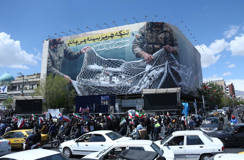 4月8日,民眾在伊朗首都德黑蘭革命廣場參加集會。廣場的大幅宣傳畫上描繪著伊朗武裝人員的形象,文字內容是“霍爾木茲海峽仍然關閉 整個波斯灣都是我們的獵場”。新華社記者沙達提攝