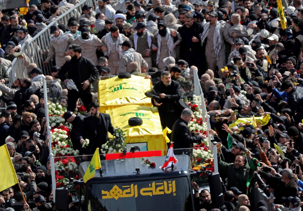 2025年2月23日,在黎巴嫩貝魯特,真主黨支持者參加真主黨前領(lǐng)導(dǎo)人納斯魯拉和薩菲丁的葬禮。新華社發(fā)(比拉爾·賈維希攝)