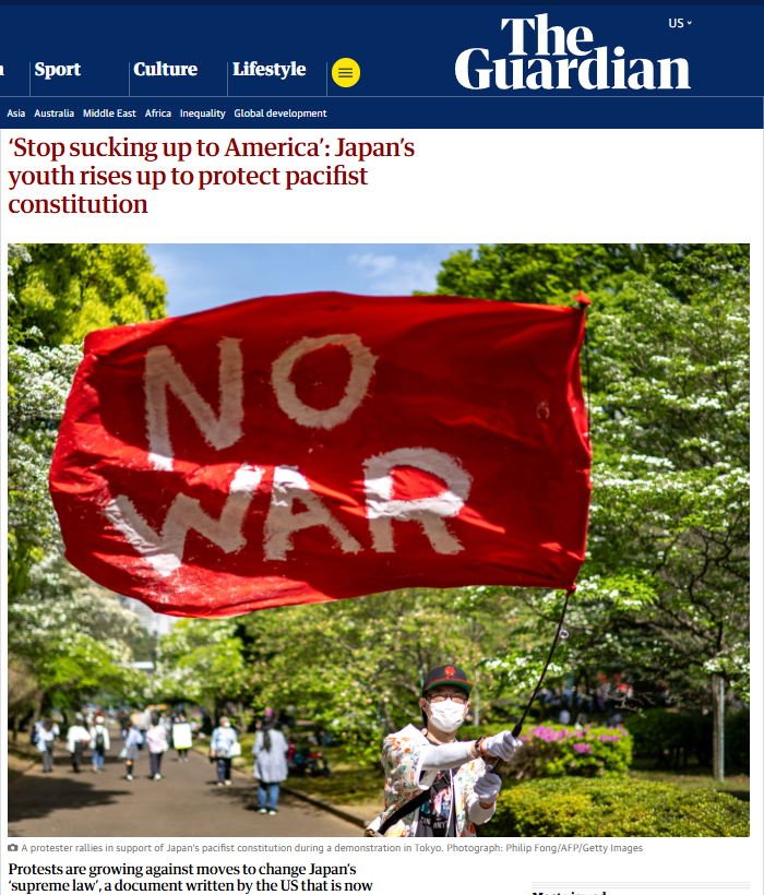 日本首相高市早苗關(guān)于修憲的相關(guān)表態(tài)引發(fā)廣泛質(zhì)疑和反對(duì)。英國《衛(wèi)報(bào)》刊發(fā)題為《“停止對(duì)美國阿諛奉承”:日本青年奮起捍衛(wèi)和平憲法》的文章,文中稱,反對(duì)修改日本和平憲法的抗議活動(dòng)日益高漲,越來越多日本年輕人正成為這場反對(duì)修憲運(yùn)動(dòng)的中堅(jiān)力量。
