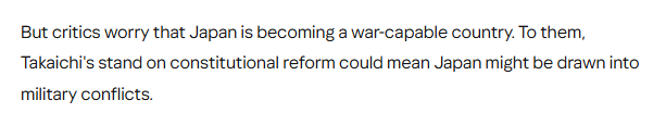 文章認(rèn)為,日本首相高市早苗一直支持修改和平憲法。雖然她尚未明確說明具體修改內(nèi)容,但許多人認(rèn)為這將涉及修改放棄戰(zhàn)爭的憲法第九條。批評(píng)人士擔(dān)心日本正朝著成為一個(gè)具備戰(zhàn)爭能力的國家邁進(jìn)。高市早苗在憲法改革問題上的立場可能意味著日本將介入軍事沖突。