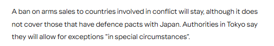 文章分析稱,此前將武器出口限制在救援、運(yùn)輸、預(yù)警、監(jiān)視和掃雷這五類裝備的規(guī)定將被取消。這意味著日本現(xiàn)在可以向包括美國和英國在內(nèi)的17個(gè)與其簽訂防務(wù)協(xié)定的國家出售殺傷性武器。對(duì)參與沖突的國家實(shí)施武器出口的禁令將繼續(xù)保留,但該禁令不適用于與日本有防務(wù)協(xié)定的國家。日本政府表示,將在“特殊情況下”允許例外處理。