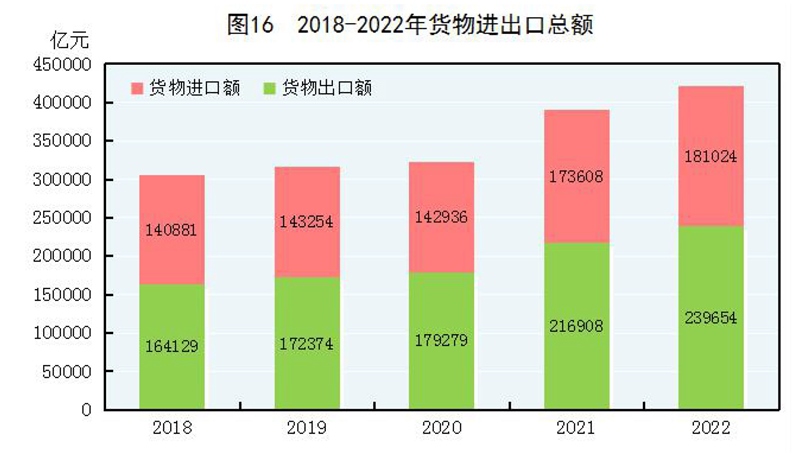 全年貨物進出口總額420678億元,比上年增長7.7%。其中,出口239654億元,增長10.5%;進口181024億元,增長4.3%。貨物進出口順差58630億元,比上年增加15330億元。對“一帶一路”[40]沿線國家進出口總額138339億元,比上年增長19.4%。其中,出口78877億元,增長20.0%;進口59461億元,增長18.7%。對《區(qū)域全面經(jīng)濟伙伴關(guān)系協(xié)定》(RCEP)其他成員國[41]進出口額129499億元,比上年增長7.5%。