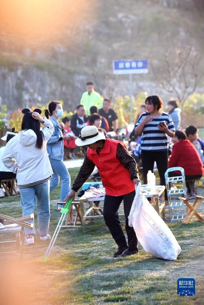 4月30日,在淄博市沂源縣悅莊鎮(zhèn)下龍巷村燒烤廣場(chǎng),一名志愿者在撿拾垃圾。