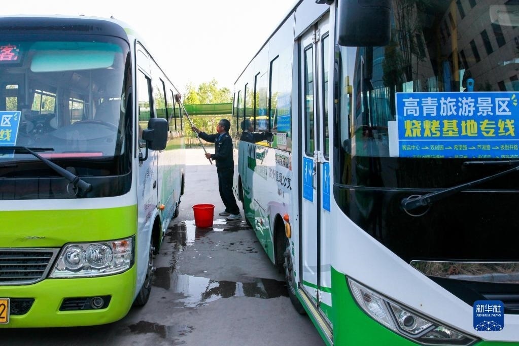 4月29日,在淄博市高青縣客運(yùn)站,一名司機(jī)在保養(yǎng)車輛。當(dāng)?shù)赝瞥?元“燒烤公交”專線方便游客出行。