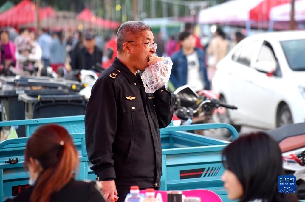 4月30日,在淄博市沂源縣悅莊鎮(zhèn)下龍巷村燒烤廣場(chǎng),鎮(zhèn)市場(chǎng)監(jiān)督管理所的一名工作人員在值勤現(xiàn)場(chǎng)吃晚餐。