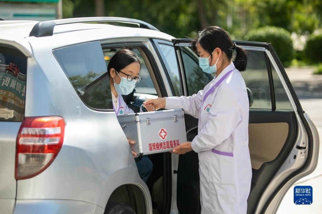 4月30日,在淄博市高青縣田鎮(zhèn)街道,志愿者備好常用藥品準(zhǔn)備乘車前往一個(gè)燒烤服務(wù)點(diǎn)工作。