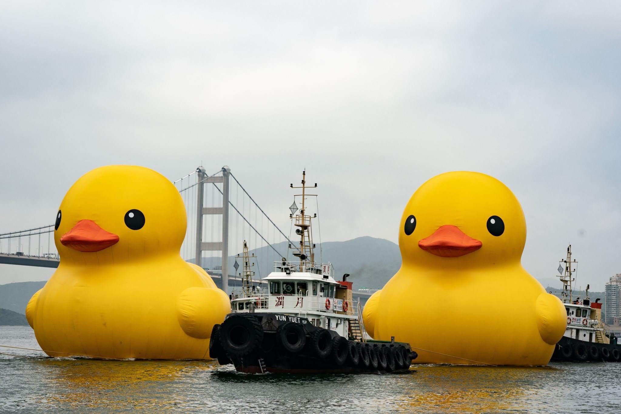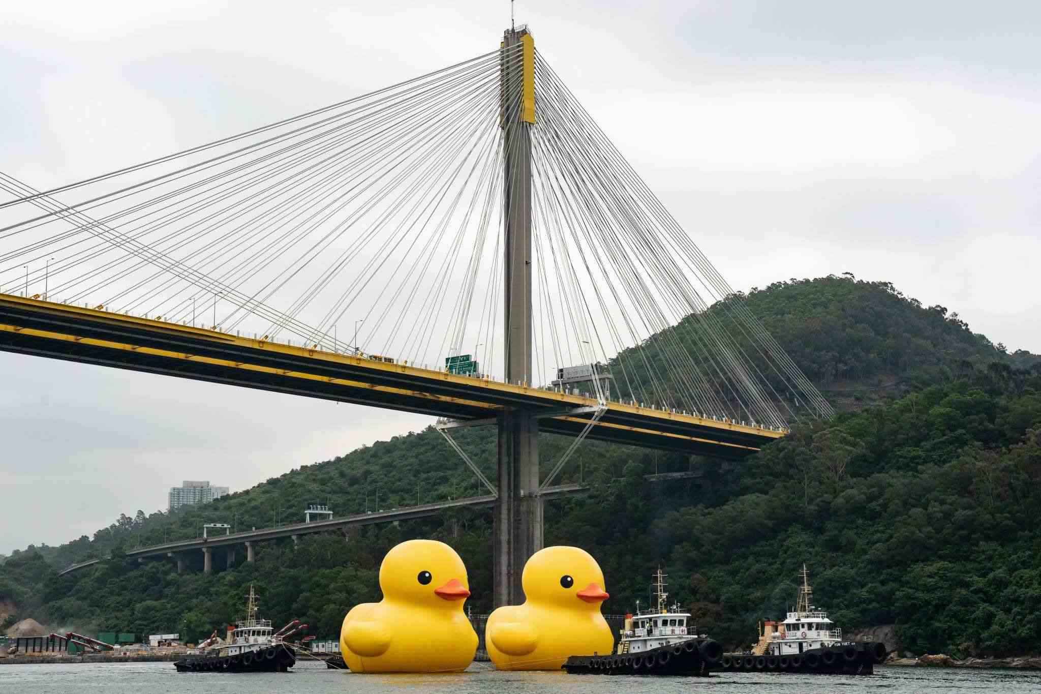 2023年5月25日,香港,兩只18米高的巨型橡皮鴨現(xiàn)身于青衣海域,引市民關(guān)注。視覺中國