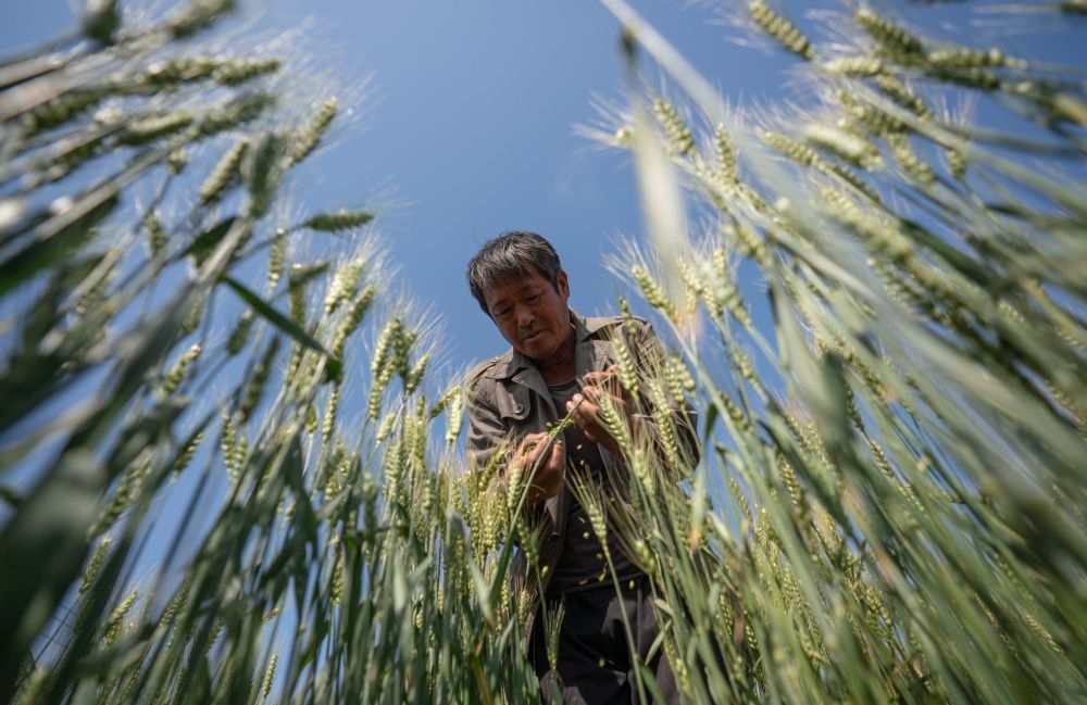 5月23日,農(nóng)民在河北滄州渤海新區(qū)黃驊市福源種植合作社的麥田里查看鹽堿地小麥長勢。新華社記者 駱學峰 攝
