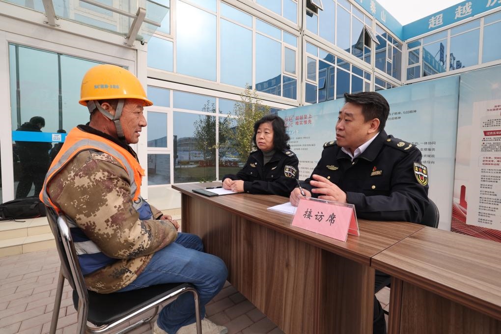 圖為北京市根治拖欠農(nóng)民工工資工作協(xié)調(diào)小組在新國(guó)展二期建設(shè)工地進(jìn)行現(xiàn)場(chǎng)接訪。(北京市人社局供圖)