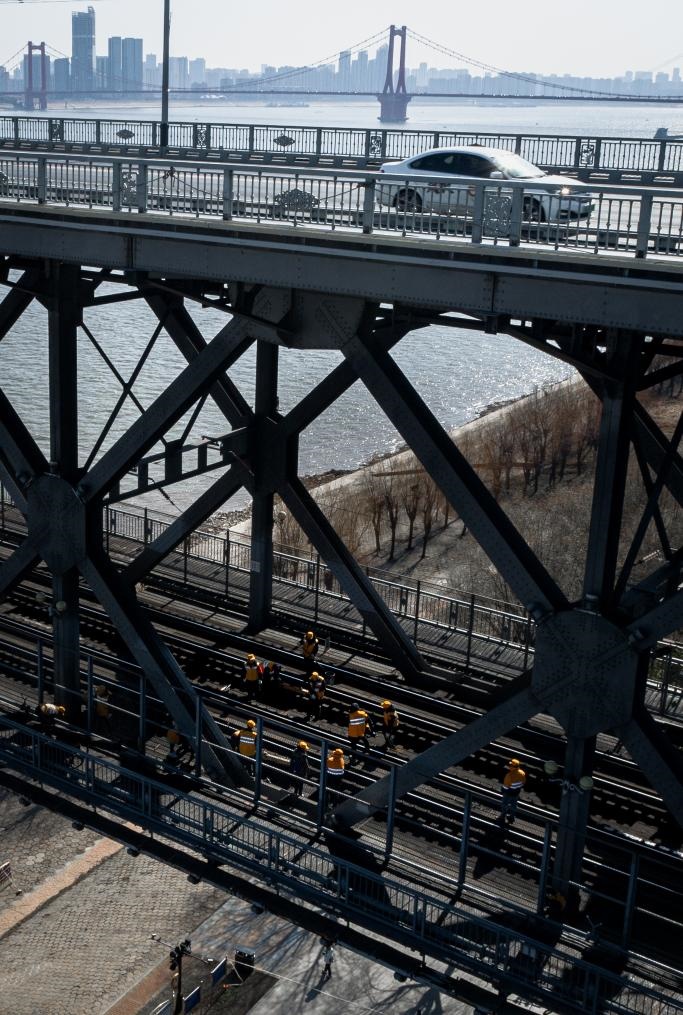 2月12日,武漢長江大橋橋梁車間員工陳卿明(左)、趙福武在武漢長江大橋上巡檢。(朱叢蓓 攝)