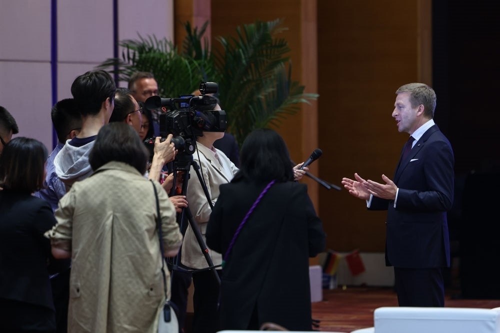 2024年4月26日,遼寧省沈陽(yáng)市與寶馬集團(tuán)深化戰(zhàn)略合作簽約儀式在沈陽(yáng)舉行,這是寶馬集團(tuán)董事長(zhǎng)齊普策接受采訪(fǎng)。新華社記者 潘昱龍 攝