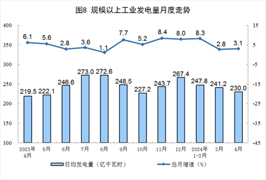 電力生產(chǎn)增速有所加快。4月份,規(guī)上工業(yè)發(fā)電量6901億千瓦時,同比增長3.1%,增速比3月份加快0.3個百分點(diǎn);日均發(fā)電230.0億千瓦時。1—4月份,規(guī)上工業(yè)發(fā)電量29329億千瓦時,同比增長6.1%。