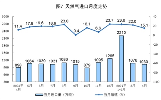 天然氣生產(chǎn)穩(wěn)定增長,進(jìn)口保持較快增長。4月份,規(guī)上工業(yè)天然氣產(chǎn)量198億立方米,同比增長3.2%,增速比3月份放緩1.3個百分點(diǎn);日均產(chǎn)量6.6億立方米。進(jìn)口天然氣1030萬噸,同比增長15.1%。