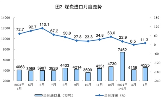 原煤生產(chǎn)降幅收窄,進(jìn)口明顯回升。4月份,規(guī)上工業(yè)原煤產(chǎn)量3.7億噸,同比下降2.9%,降幅比3月份收窄1.3個百分點(diǎn);日均產(chǎn)量1239萬噸。進(jìn)口煤炭4525萬噸,同比增長11.3%。
