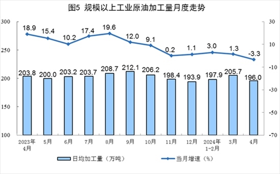 原油加工有所下降。4月份,規(guī)上工業(yè)原油加工量5879萬噸,同比下降3.3%,3月份為增長1.3%;日均加工196.0萬噸。1—4月份,規(guī)上工業(yè)原油加工量24126萬噸,同比增長1.1%。
