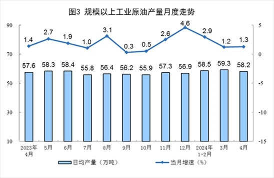 原油生產(chǎn)平穩(wěn)增長,進(jìn)口由降轉(zhuǎn)增。4月份,規(guī)上工業(yè)原油產(chǎn)量1747萬噸,同比增長1.3%,增速比3月份加快0.1個百分點(diǎn);日均產(chǎn)量58.2萬噸。進(jìn)口原油4472萬噸,同比增長5.9%。
