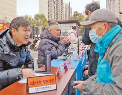 寶山區(qū)新顧城大居拓展區(qū)聯(lián)合黨支部開展便民服務活動。圖為工作人員為居民提供法律咨詢。