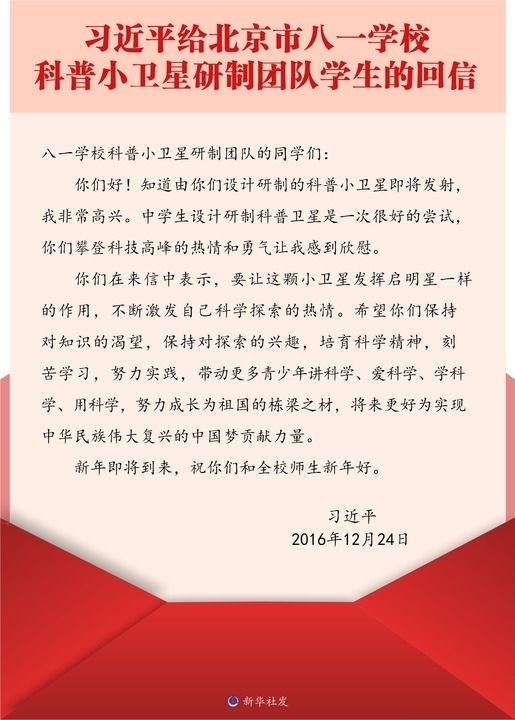 三個多月后,同學(xué)們給習(xí)近平總書記寫信,報(bào)告小衛(wèi)星即將發(fā)射的消息,很快收到了總書記的回信。習(xí)近平總書記在回信中說,“你們攀登科技高峰的熱情和勇氣讓我感到欣慰”“希望你們保持對知識的渴望,保持對探索的興趣,培育科學(xué)精神,刻苦學(xué)習(xí),努力實(shí)踐,帶動更多青少年講科學(xué)、愛科學(xué)、學(xué)科學(xué)、用科學(xué),努力成長為祖國的棟梁之材”。
