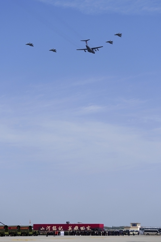 9月12日,第十二批在韓中國人民志愿軍烈士遺骸回國。這是為接運(yùn)烈士遺骸回國的運(yùn)-20專機(jī)伴飛護(hù)航的殲-20飛機(jī)。