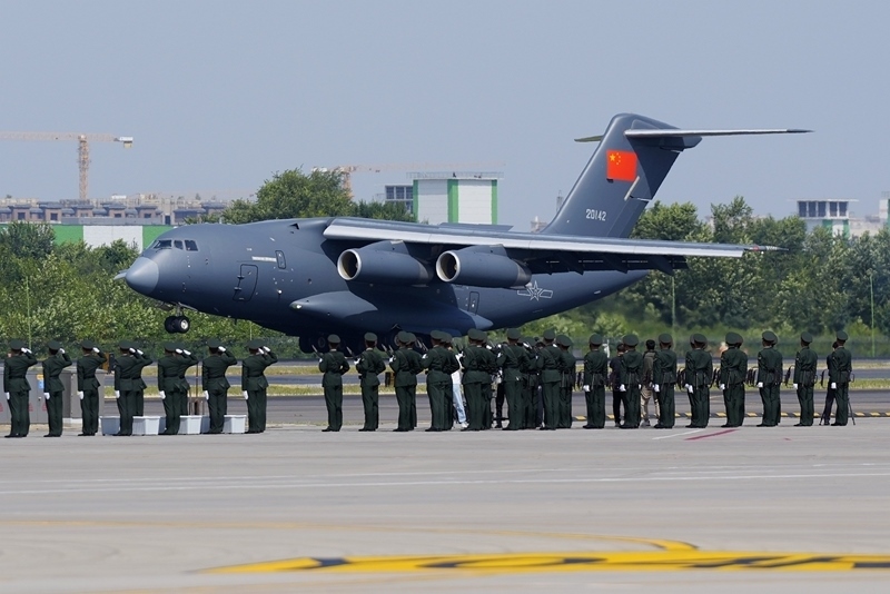 9月12日,第十二批在韓中國人民志愿軍烈士遺骸回國。這是接運(yùn)烈士遺骸回國的運(yùn)-20飛機(jī)降落在沈陽桃仙國際機(jī)場(chǎng)。