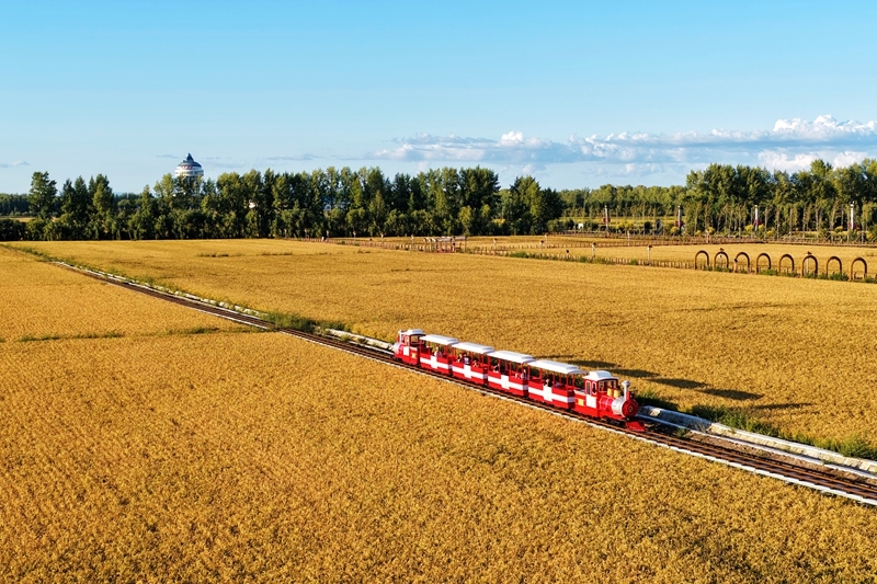 9月6日,在黑龍江省佳木斯市同江市,旅游小火車在稻田間行駛(無人機照片)。