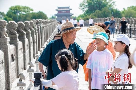 抗戰(zhàn)親歷者鄭福來在盧溝橋上向游客們講解抗戰(zhàn)史。(資料圖)原梓峰 攝
