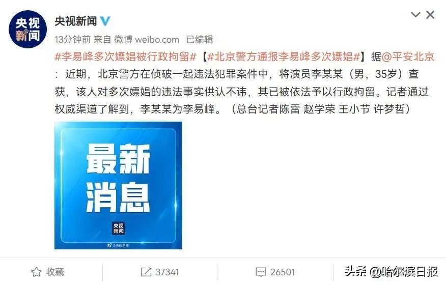 另?yè)?jù)央視消息,確認(rèn)李某某為演員李易峰。