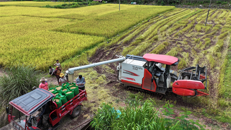 8月31日,在福建省南平市浦城縣仙陽鎮(zhèn),村民駕駛收割機在田間作業(yè)(無人機照片)。