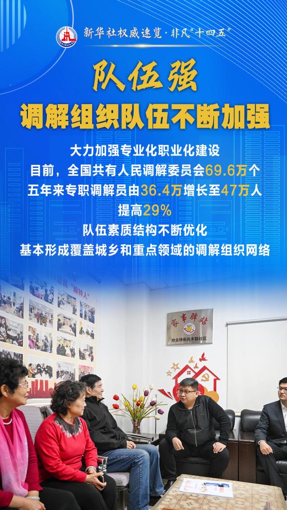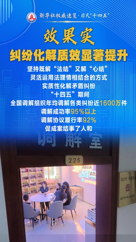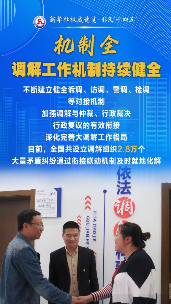 “十四五”期間,司法部堅持和發(fā)展新時代“楓橋經驗”,充分發(fā)揮調解職能作用,以“機制全、領域廣、隊伍強、效果實”十二字為工作“秘訣”,大力加強矛盾糾紛排查化解,切實保障群眾合法權益,維護社會和諧穩(wěn)定。