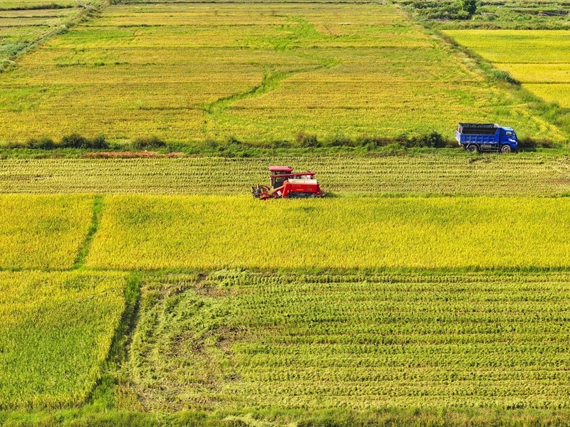 10月11日,湖南省衡陽市衡山縣白果鎮(zhèn)村民駕駛農機收割稻谷(無人機照片)。
