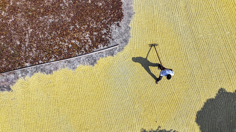 10月11日,湖南省常寧市蘭江鄉(xiāng)農民在晾曬稻谷(無人機照片)。