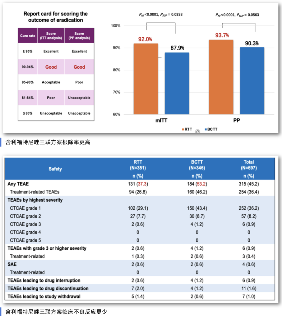 這項在中國開展的多中心、隨機(jī)、雙盲、陽性對照研究,納入700例幽門螺桿菌感染初治患者。宋志強(qiáng)介紹,利福特尼唑是我國自主研發(fā)的全球首創(chuàng)新型分子實體藥物,專門針對幽門螺桿菌感染研發(fā)。相關(guān)基礎(chǔ)和臨床研究結(jié)果均顯示,幽門螺桿菌對該藥物普遍敏感,最小抑菌濃度低,有效克服幽門螺桿菌高耐藥問題,而且表現(xiàn)出良好的安全性。