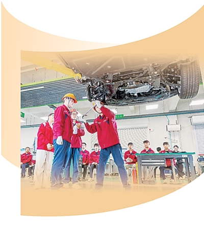 山東水利技師學(xué)院實訓(xùn)中心,學(xué)生正進(jìn)行整車維修和保養(yǎng)操作。