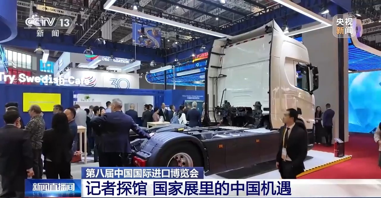 我的AI眼鏡第一時間就捕捉到了這個“大塊頭”,放眼望去,整個國家展里沒有比它還大件的展品了。這輛高端重卡車型來自瑞典,是享有“公路之王”美譽(yù)的瑞典企業(yè)斯堪尼亞帶來的重型運(yùn)輸領(lǐng)域的最新成果。別看它塊頭大,新技術(shù)賦予了它高效節(jié)能的特點(diǎn),是今年國家展里最吸睛的展品之一。