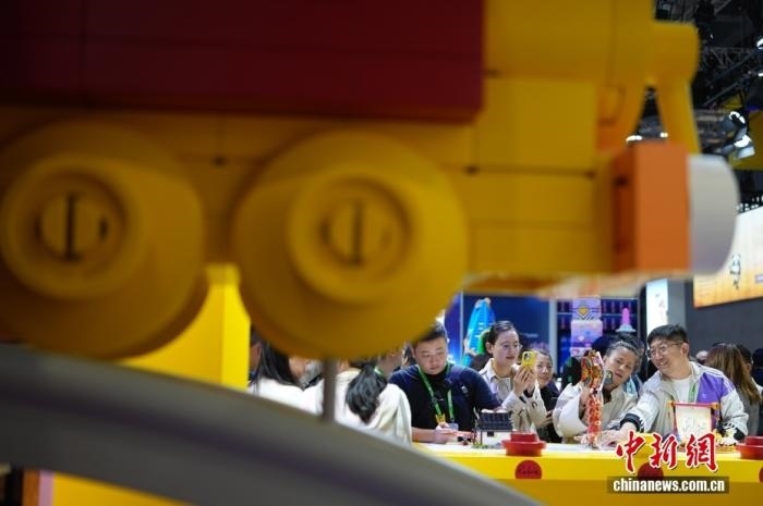 11月6日,上海,第八屆中國國際進(jìn)口博覽會消費(fèi)品展區(qū)人氣旺。圖為樂高展臺吸引參觀者。中新社記者 蔣啟明 攝